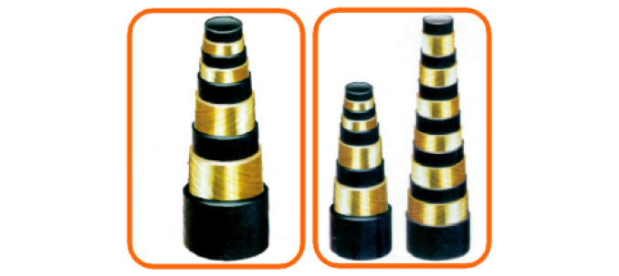 主要有內(nèi)膠層、中膠層、2、4、6層鋼絲纏繞層、外膠層組成。內(nèi)膠層具有輸送介質(zhì)、承受壓力,保護(hù)鋼絲不受侵蝕的作用,外膠層保護(hù)鋼絲不受損傷,鋼絲層是骨架材料,起增強(qiáng)作用。